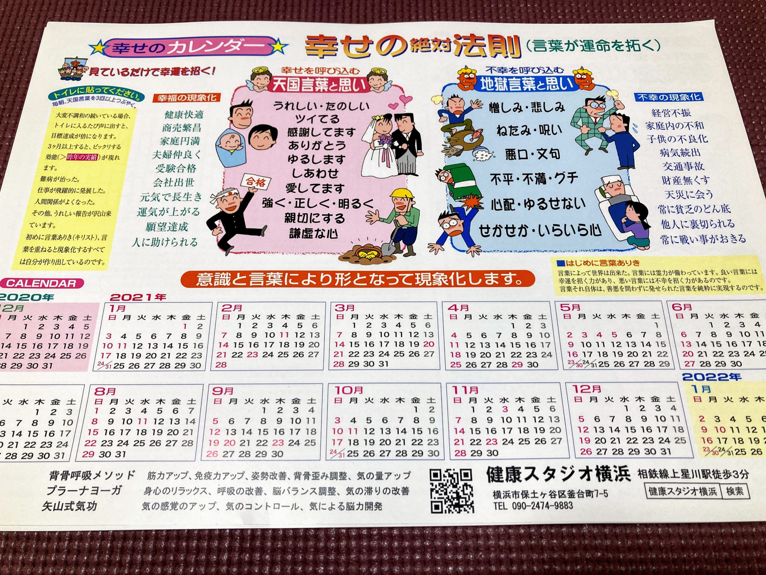 幸せのカレンダーは、健康スタジオ横浜に置いてありますので、教室、セミナーにお越しの際にどうぞご自由にお持ちになってください。